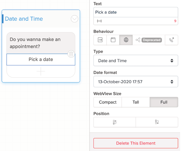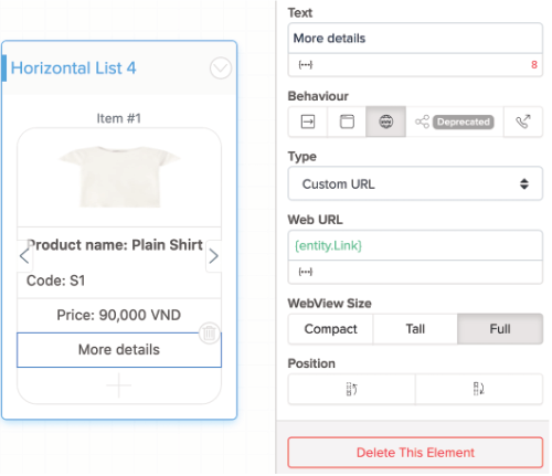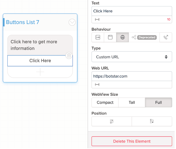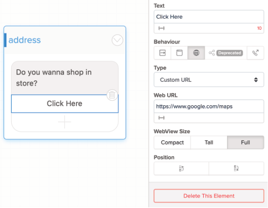 Vous pouvez le faire avec une Horizontal List (liste horizontale), ou Buttons List (liste de boutons) : cliquez sur le bouton > dans Behaviour (comportement) dans le panneau Properties (propriétés) à droite, choisissez Open Webview > dans le champ Web URL, ajoutez l'URL de votre choix > puis allez sur Publish et cliquez sur Update. Désormais, lorsqu'un utilisateur de chat clique sur le bouton, il sera dirigé vers un autre site.