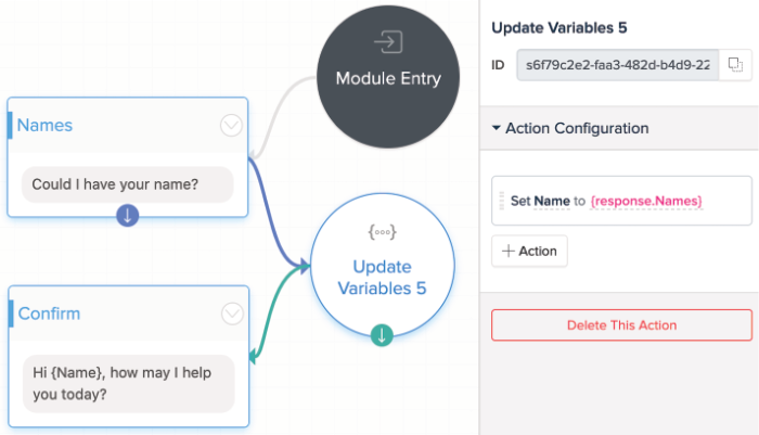 6. J'ai créé des Variables dans le pannel Data et activé Expect User Response (réponse utilisateur attendue), mais il n'y a pas de données dans les Variables. Comment pourrais-je le faire fonctionner? Il est important d'ajouter l'Action Block "Update Variables" (bloc d'action "mise à jour des variables) après que les utilisateurs du chat ont donné leurs réponses. Vous ne pouvez pas enregistrer de données dans des variables sans blocs de mise à jour des variables.