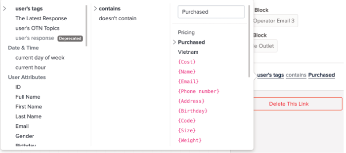 Après cela, vous pouvez ajouter des conditions pour le Tag. Une fois que les utilisateurs du chat avec le Tag suivent le flux de conception, la condition les mènera au bon connecteur, ils peuvent alors entrer dans le module Programme de promotion: cliquez sur le connecteur Add Condition > choisissez le Tag de l'utilisateur et configurez les blocs suivants comme vous le souhaitez..