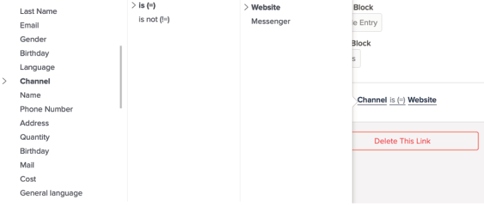 Pour obtenir ce fait, vous pouvez cliquer sur le connecteur > Add Condition > choisissez Channel > is (=) > Website/ Messenger. Ainsi, une fois que les clients sont issus du Messenger, ils suivront le flux spécifique, tout comme les personnes qui proviennent du site Web.