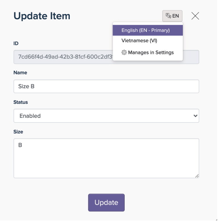 Mettez à jour un Item (élément) comme d'habitude avec la langue que vous avez définie pour votre bot au début. Vous ne pouvez pas basculer entre les langues car il n'y a qu'une seule langue choisie.