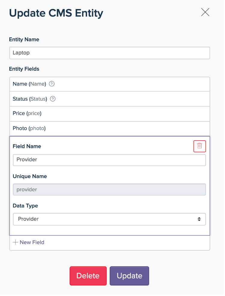 - Field Name (nom du champ) : définissez le nom d'une entité (par exemple, photo, prix, description, etc.).