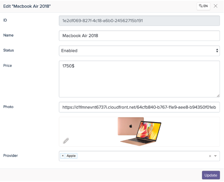 Parfois, vous souhaitez mettre à jour les données d'un Item (élément) dans l'Entity (entité). Pour ce faire, vous devez d'abord choisir un Item (élément) à modifier. Après cela, une fenêtre contextuelle apparaîtra et vous permettra de modifier les éléments. Vous pouvez alors mettre à jour le Item (élément) et cliquer sur Update (mettre à jour).