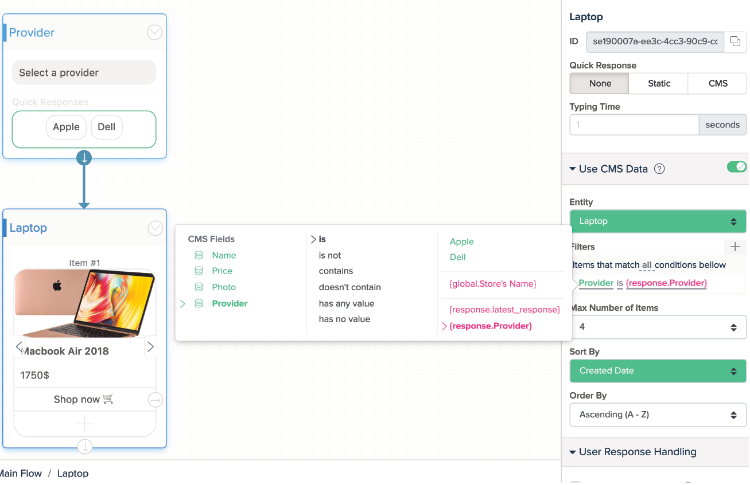 Chaque fois que vous mettez à jour les listes d'éléments de l' entité Fournisseur et de l'entité Ordinateur portable , les blocs du canevas mettront automatiquement à jour les boutons Réponses rapides correspondants ou dans le bloc Horizontal. Vous n'avez pas besoin de modifier ou d'ajouter d'autres blocs dans Bot Builder.
