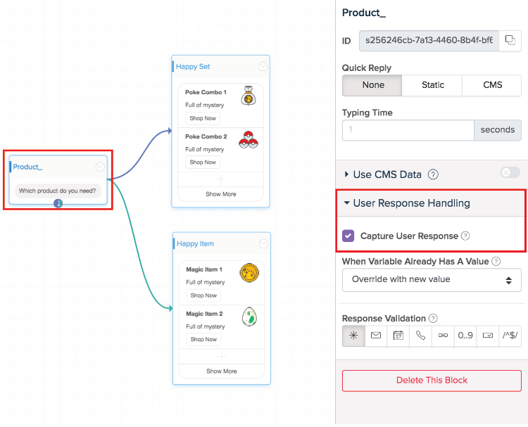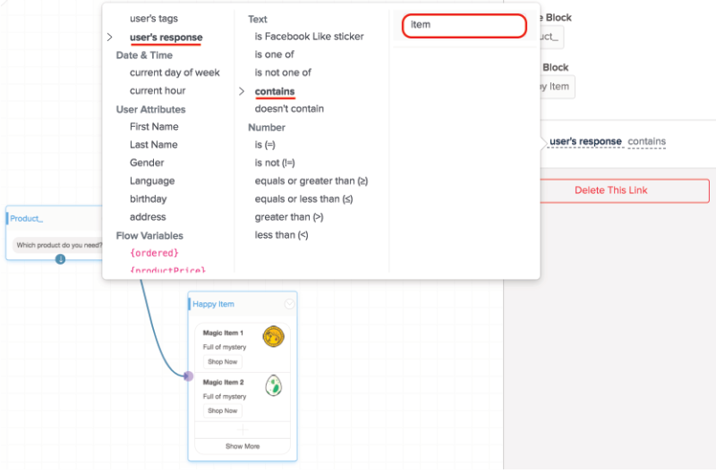 Sur chaque connecteur démarrant du bloc Produit au bloc Happy Set et au bloc Happy Item, définissez une condition avec la structure suivante: User's response - contains - keyword of product (réponse de l'utilisateur - contient - mot-clé du produit) . Si la réponse de l'utilisateur correspond aux mots-clés prédéfinis, l'utilisateur sera dirigé vers le bloc correspondant.