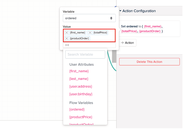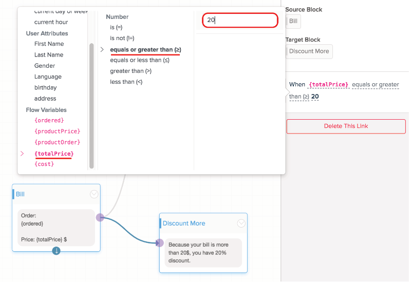 Utilisez les Variables du flux pour diriger les utilisateurs dans le flux. Par exemple: offrez des bons de réduction aux utilisateurs en fonction de la valeur de la commande. S'il est supérieur à 20 $, les utilisateurs bénéficient d'une réduction de 20%.