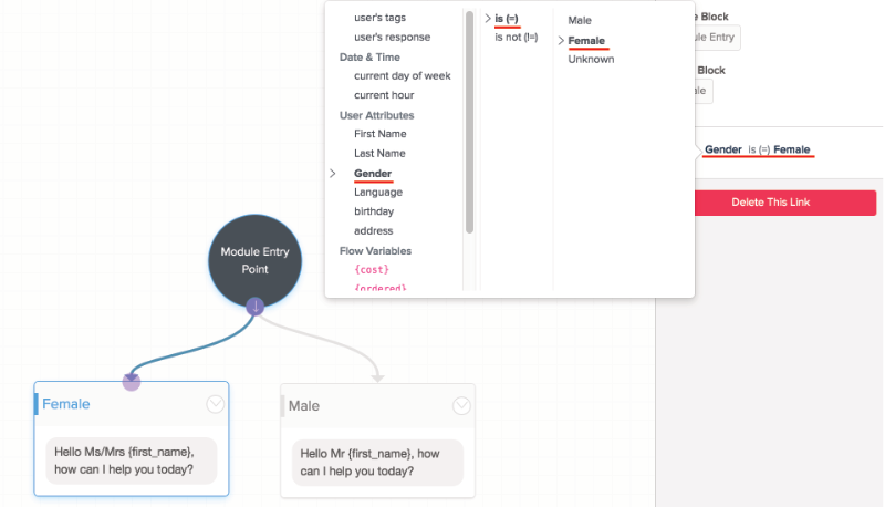 Utilisez les User Attributes (attributs utilisateur) pour diriger les utilisateurs dans le flux. Par exemple: saluez un utilisateur avec un titre approprié basé sur le sexe.