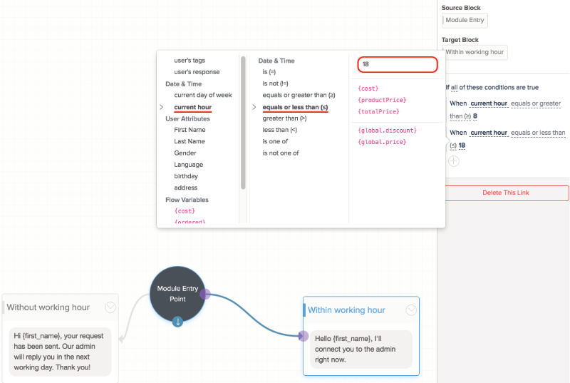 Tout d'abord, vous devez créer une variable pour les heures ouvrables et l'utiliser dans l'état des connecteurs pour envoyer les messages appropriés. Par exemple, les heures de bureau de votre entreprise sont de 8 h 00 à 18 h 00, si un client envoie des requêtes en dehors de cette période, le bot suggérera de répondre le jour ouvrable suivant.