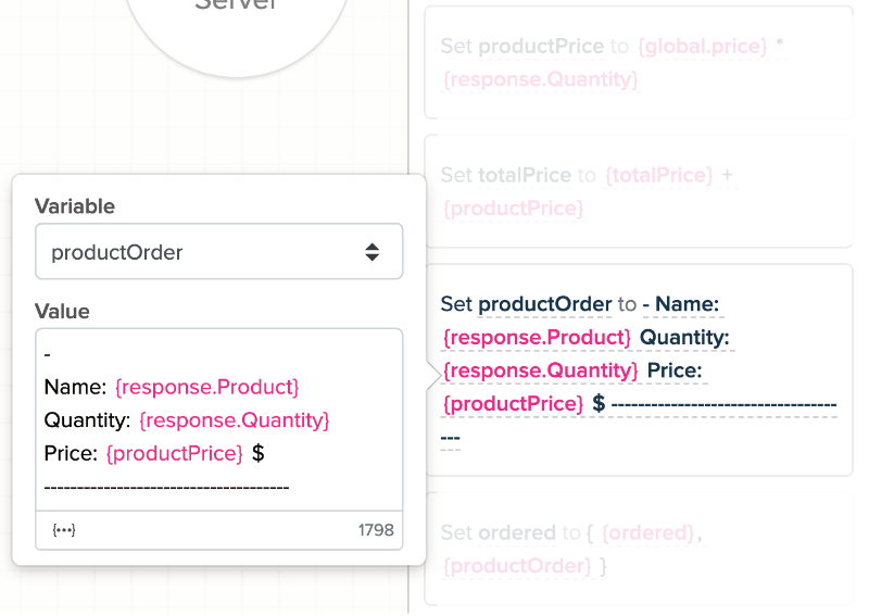 Pour la Variable qui a le type de données "Text" (texte) Une fois toutes les Sous-Variables mises à jour, sa valeur sera dans la même structure que vous avez définie auparavant. Par exemple, vous définissez le contenu de la Variable productOrder pour inclure les informations de commande: