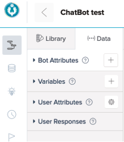 Le Panneau Data (données) est à côté du Panneau Library (bibliothèque). Ce panneau contient toutes les données dynamiques telles que les Variables, les User Responses (réponses de l'utilisateur), les User Attributes (attributs de l'utilisateur) et les Bot Attributes (attributs du Bot). Par exemple, vous pouvez utiliser les Variables de chaque ChatBot comme {first name} pour accueillir vos clients et offrir une expérience personnalisée. Vous pouvez également créer vos propres attributs personnalisés, collecter les informations de vos clients pour une utilisation ultérieure. Ces Variables sont idéales pour créer des fonctionnalités qui nécessitent des calculs, des réservations et des commandes.