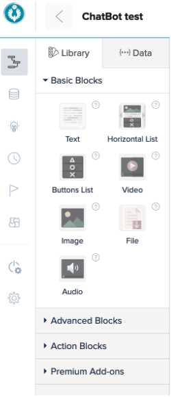 Nous rassemblons les fonctions les plus populaires que les ChatBots peuvent exécuter dans le Panneau Library (bibliothèque). C'est le premier onglet situé dans la colonne de gauche du Bot Builder (générateur de robots). Le Panneau Library (bibliothèque) contient tous les types de blocs dont vous avez besoin pour configurer le Flow (flux) d'un ChatBot, notamment:
