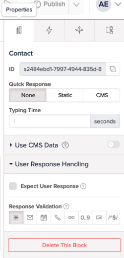 Typing Time (temps de frappe) : affiche le temps auquel le message est remis à l'utilisateur du chat. Par exemple, si le temps de saisie d'un bloc est de 3 secondes signifie qu'ils doivent attendre 3 secondes pour que le ChatBot compose le message et l'affiche.