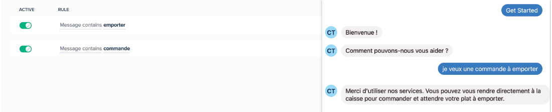 Nous imaginons que le message de l'utilisateur du chat est "Je souhaite commander des plats à emporter". Voici le résultat: