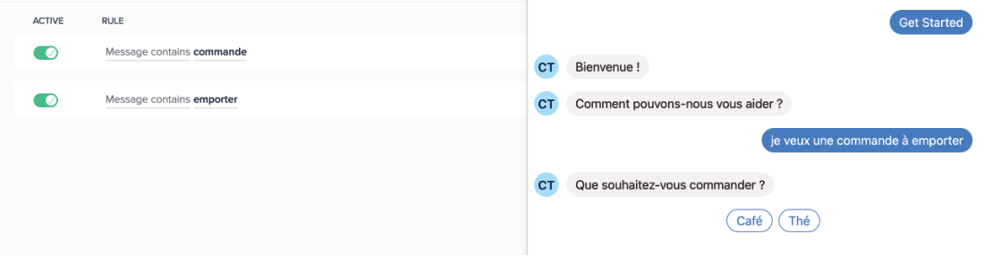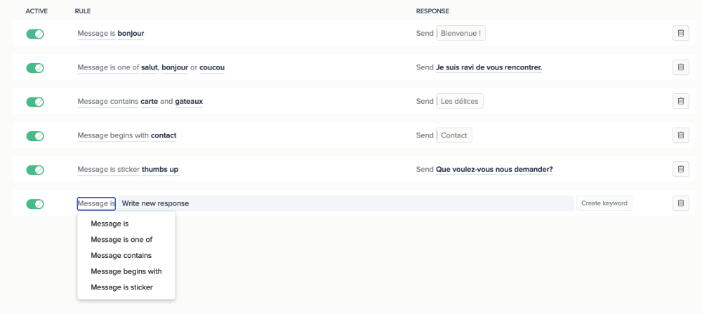 Le mot-clé est Message contains (le message contient) " heure d'ouverture " avec la réponse est " Notre magasin de café ouvre à 8 heures et ferme à 22 heures "