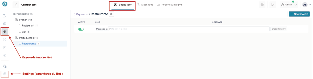 ▶︎ Entraînez votre bot avec Keywords (mots-clés)