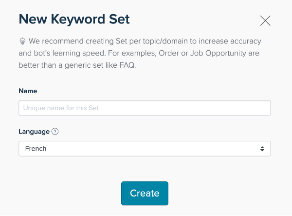 Nous vous recommandons de créer un ensemble par sujet. Cliquez sur New Word Set (nouvel ensemble de mots-clés) ou dirigez-vous vers le bouton « + » à côté de la langue dans laquelle vous souhaitez créer l'ensemble de mots-clés. Par exemple, si vous construisez un ChatBot de logement, la création d'un ensemble Cuisine et d'un ensemble Salon séparément est mieux et plus facile à contrôler qu'un ensemble général qui regroupe tous les deux. Name (nom): donnez un nom à l'ensemble de mots-clés.